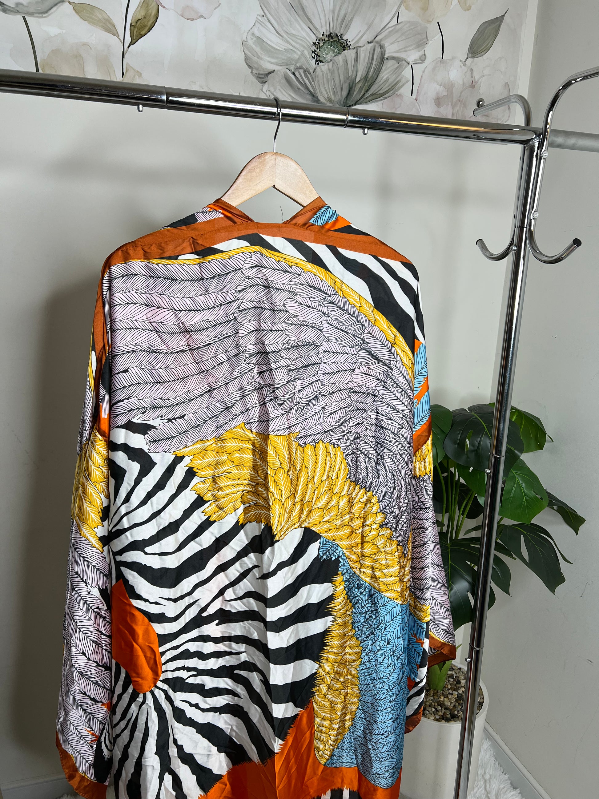 When your love for color-blocking collides with your love of animal print sprinkled in. with your appreciation for abstract....This stunning bold kimono is just that. Its silky material will give you an instant feel of luxuriousness. Our open-front kimono is perfect for everyday wear from lounging around, date night, family beach days, and everything in between.